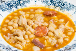 Ternera y cerdo aportan sus carnes a este contundente plato que completan los garbanzos y el inconfundible toque picante.